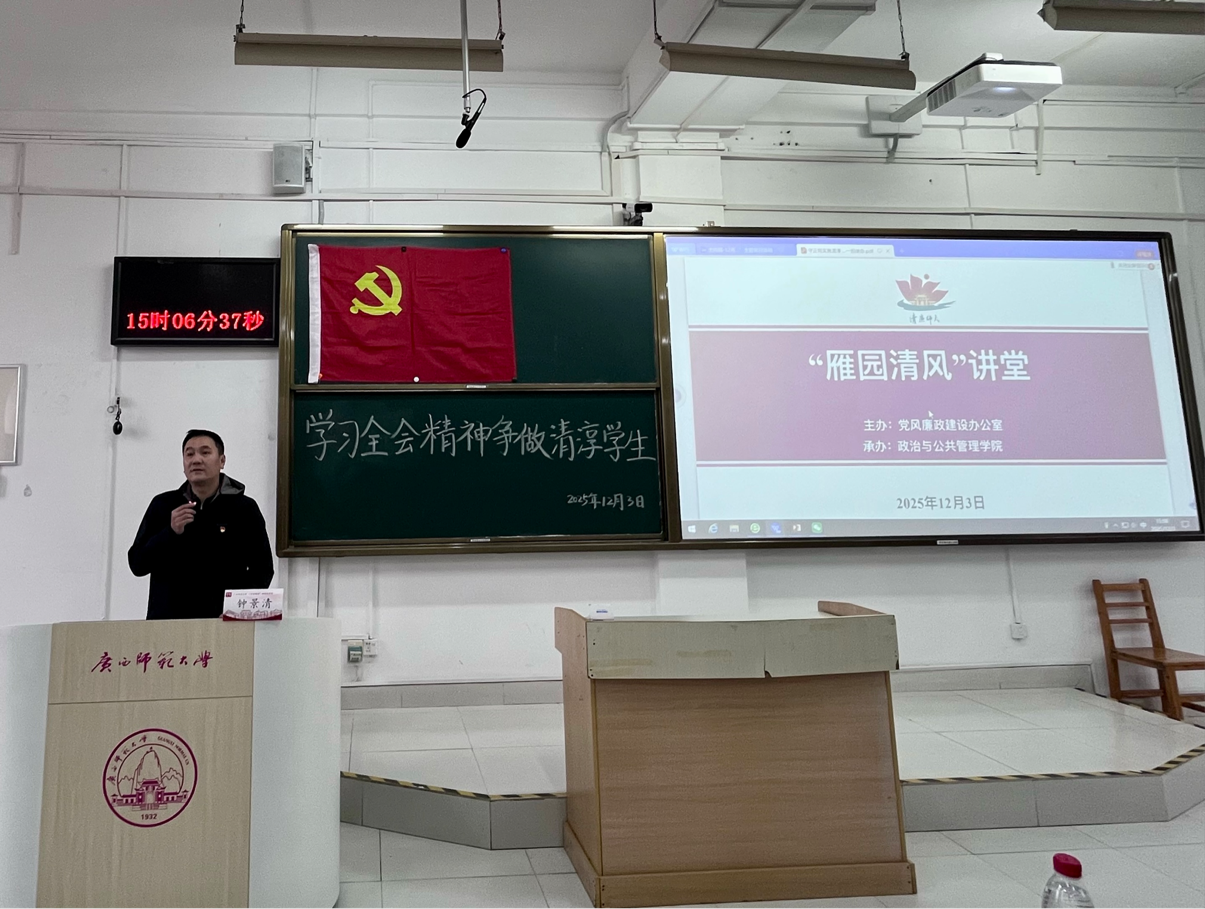 12月3日,由广西师范大学党风廉政建设办公室主办、政治与公共管理学院承办的“雁园清风”讲堂首场讲座,于雁山校区文四区302教室顺利举行。本次活动以“学习全会精神,争做清淳学生”为主题,特邀政治与公共管理学院党委副书记、纪委书记钟景清老师担任主讲人,共有一百余名学生积极参与。