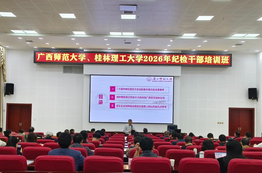 2026年1月17日至1月20日,驻校纪检监察组协同校党风廉政建设办,与桂林理工大学联合举办了2026年纪检干部培训班。自治区纪委监委驻广西师范大学纪检监察组组长莫坷以《学习贯彻中央纪委二十届五次全会精神》为题,及时传达了二十届中央纪委五次全会精神和自治区十二届纪委六次全会精神,并就贯彻落实会议精神提出了具体要求。驻校纪检监察组干部、驻在学校党风廉政建设办以及驻在学校的基层纪委书记70余人参加培训。